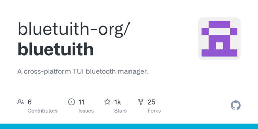 darkhz@feddit.nl · 9 days agobluetuith - A TUI based Bluetooth Manager v0.2.6 is released (Windows/MacOS support)plus-squaregithub.comexternal-linkmessage-square1fedilinkarrow-up135arrow-down11