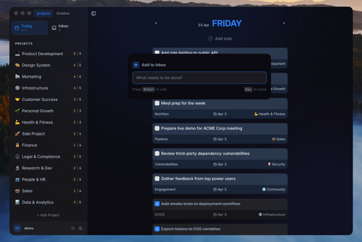 arrow-up199arrow-down1imageModern offline-first self-hosted open-source TickTick/Todoist alternative. Now with desktop app and quick add global OS popup!plus-squarelemmy.worldquolpr@lemmy.worldEnglish · 3 days agomessage-square17fedilink