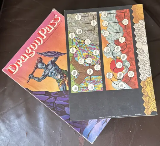 My interests are somewhat different. The photo is of a board game called Dragon Pass (this edition from 1980), the first published material relating to the world Glorantha which was eventually explored through the Runequest role-playing game.