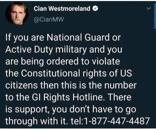 A tweet states that National Guard or Active Duty military ordered to violate constitutional rights can call the GI Rights Hotline for support, with the number 1-877-447-4487 provided.