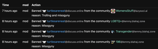 I get that I broke their rule, and I can be banned there for that - but they didn’t ban me for being a man, they banned me for hurting their feelings. And now I can’t use LGBTQ and Trans communities as a result. OK, fuck turtlesareneat, he shouldn’t be allowed in queer communities cause he hurt a mod’s feelings.