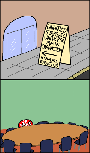 As it turns out: everything can go wrong. The comic is correct: nobody in the cast is likeable. SGU’s writing team wrote themselves into a corner on the first episode, with a bunch of assholes trapped together in what can only be described as the escape-room squad from hell. This undermines the show’s premise from the outset, as though Stargate Command didn’t bother to assess anyone’s personality for the project. Then they undermine every plotline with needless conniving, scheming, and back-biting, with no apparent grasp on the instinctive survival benefits to cooperation. Then they use the body-snaching-ansible-thing to be even more dickish to each other’s personal lives and families, back on Earth. Our suspension of disbelief is broken through incompetence at every level of SGC through to the cast itself, then kicked into the dirt even harder by stupendous levels of bad psychology, and finally shot in the head by just a miserable viewing experience.