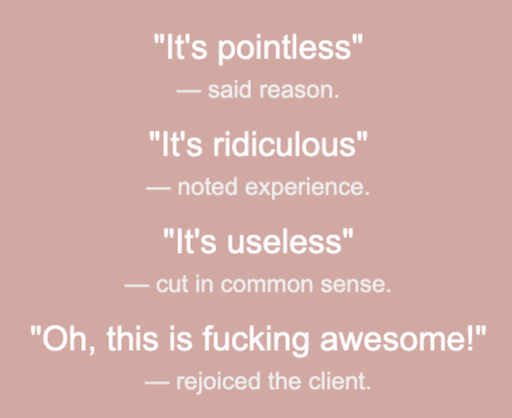 When you spend a couple months making sure that your app is formatted, linted, memory-safe, is modular and extensible, has 100% unit test coverage and a comprehensive integration test suite, checks all that on CI, has fully automated CD, blue-green deployments, deployment monitoring, and finally paid an external consultant for a security audit, but it lacks that one feature that the client actually wanted (but didn’t tell you to focus on), they will get angry. After all, they paid you a bunch of cash and all you have to show for it is an unfinished product.