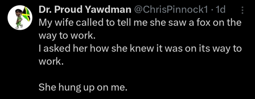 H: “Sorry, I didn’t quite catch that. You saw a fox on the way to work?”