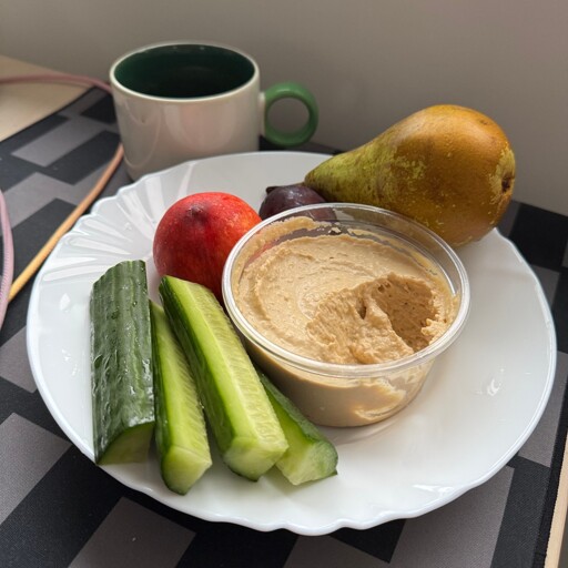 I had a Bowl of baked oats, nuts and seeds mixed with some blueberries, one half of a pear, unflavored yoghurt and some apple-apricot puree. And a cup of coffee to drink.