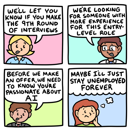 Uff! When I was interviewing a few months ago, I was honest in an interview and said I was lukewarm on AI. The recruiter threw me a bone and said, “When you talk with the hiring manager, make sure you say you’re really excited about AI.”