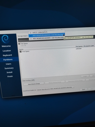 /dev/md127is probably a raid 1 from a previous installation. Assuming you don’t need the data on it, you can either delete or ignore it.I’m not familiar with this exact installer, but I have installed Debian a bunch before. Judging by what I’m seeing here, you probably need to do a bit of manual labor. I’m guessing you first create partition tables (usually gpt), then raid partitions, then combine them into a raid, and maybe then put lvm on top of that again, and finally a filesystem. If you’re planning to go the lvm route you probably want to create a smaller raid on the start of the disk for