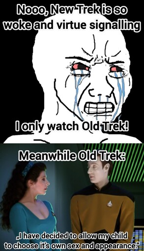 Good social commentary doesnt get labeled as woke because its not hitting people over the head to make a point. Next Generation is filled with that type of quality social commentary. I dont know about new trek, but id imagine people get upset at the “wokeness” because it features the same type of garbage social commentary shoehorning that has become prevalent in a lot of media. Quality writing that makes points on social commentary in a more subversive and plot-centered way has long since become an artifact of the past