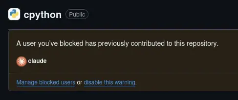 cpython is the reference implementation of the python interpreter. The person who took this screenshot has the Claude user on GitHub blocked so that whenever it contributed to a git repo you see this warning. The Claude user is an AI agent. AI code is garbage.
