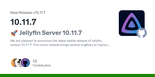 🚀 Jellyfin Server 10.11.7 We are pleased to announce the latest stable release of Jellyfin, version 10.11.7! This minor release brings several bugfixes to improve your Jellyfin experience. As alway...