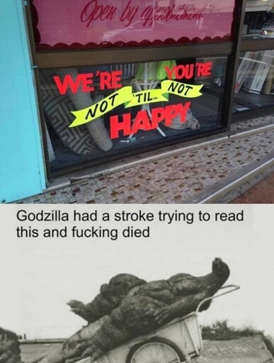 minus-squareDarkassassin07@lemmy.calinkfedilinkEnglisharrow-up45·4 days ago'we’re not happy ‘til you’re not happy’ Well, I’m not happy trying to read that, so… Mission successful?