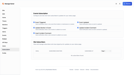 rajnandan1@lemmy.world to Selfhosted@lemmy.worldEnglish · edit-28 months agoKener open source status page v3.2.14 released with the most requested change: Subscribe to monitorsplus-squarelemmy.worldimagemessage-square3fedilinkarrow-up146arrow-down11